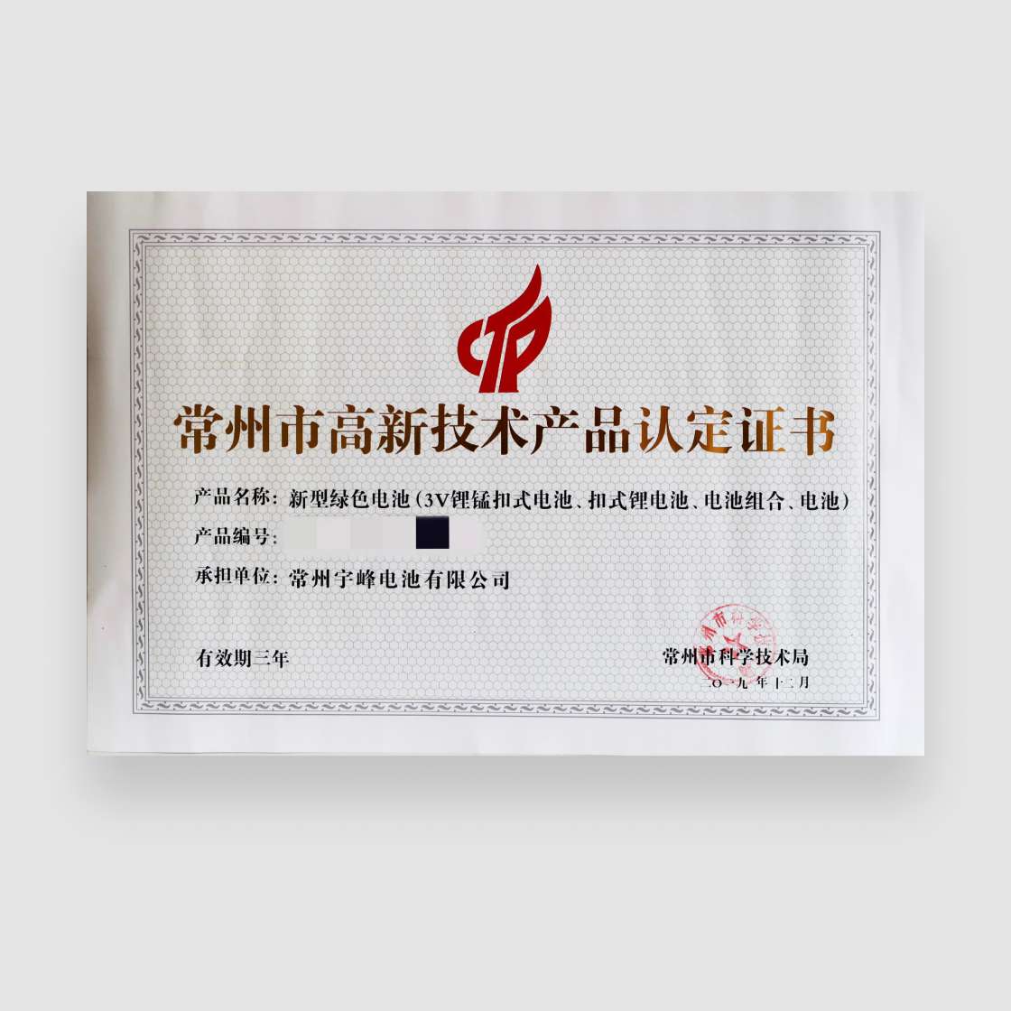 公司產品CR2450,CR2477 電池為“省高新技術產品”